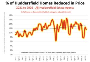 - 192 of the 1,602 properties each month in Huddersfield during 2026 reduced their asking prices, an overall reduction rate of 12.0%